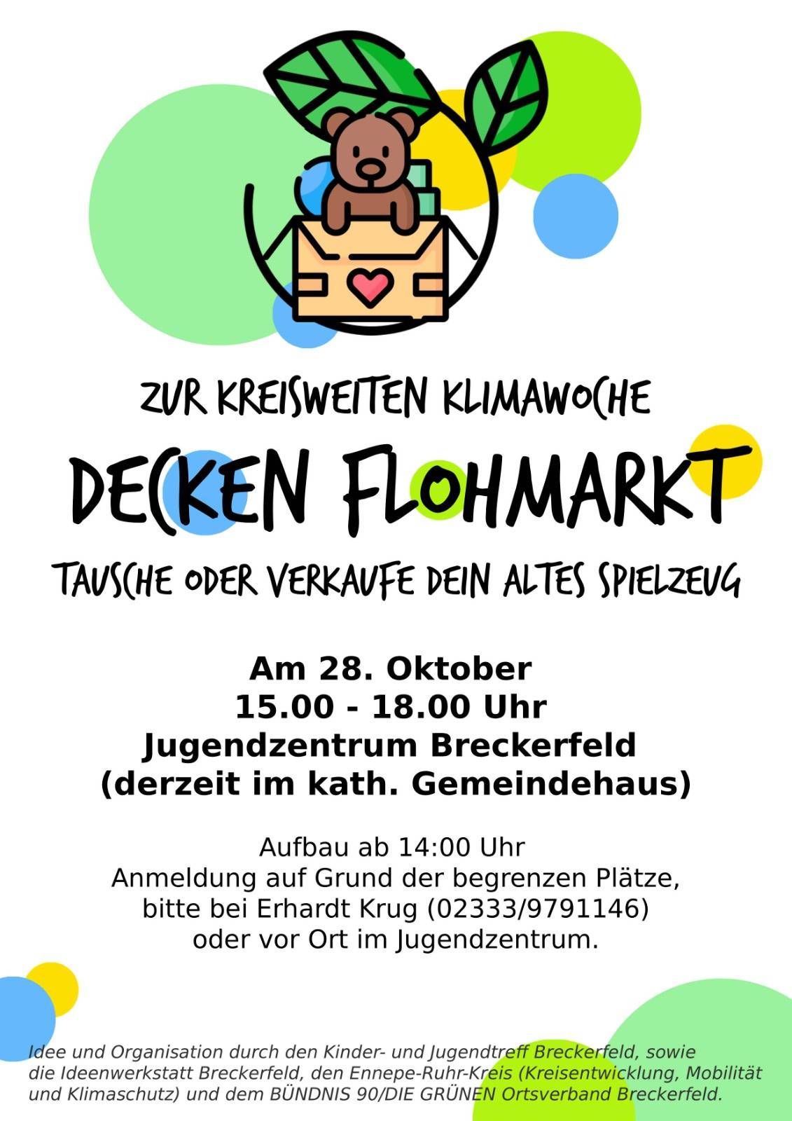 In der Woche vom 27. bis 31. Oktober findet die kreisweite Klimawoche statt – und Breckerfeld ist auch mit vielen Aktionen dabei! Gemeinsam mit dem Jugendzentrum organisieren wir am 28. Oktober einen Kinderdeckentrödel. Alle Infos findet ihr im angehängten Flyer, den ihr gerne weiterleiten dürft. Weitere Termine und Events der Klimawoche gibt es hier: