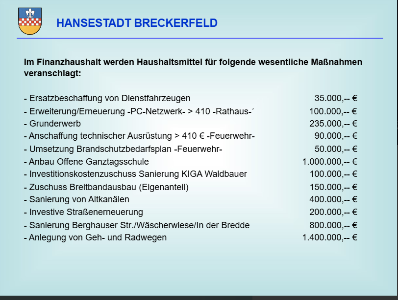 Geplante Investitionen für das Jahr 2026 in Breckerfeld.