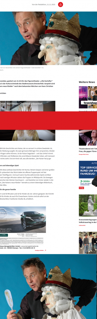 Matthias Kuchta erzählt diese zeitlose Geschichte mit Humor, feinem Gespür und einer großen Portion Spielfreude. Er präsentiert das Stück dabei als offenes Puppenspiel mit fast lebensgroßen, weichen Textilfiguren. Und auch wenn Kuchta während des Spiels sichtbar bleibt, stehen schon nach wenigen Minuten stehen die Puppen im Mittelpunkt: Sie bewegen sich direkt vor und zwischen den kleinen Zuschauern – und beziehen sie immer wieder in die Handlung ein. So wird „Des Kaisers neue Kleider“ beinahe zu einem lebendigen Bilderbuch, bunt, greifbar und voller Witz.