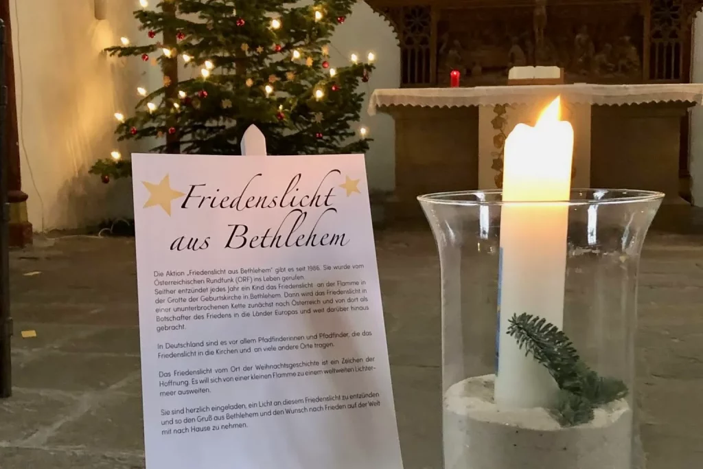 Die Aktion „Friedenslicht aus Bethlehem“ besteht seit dem Jahr 1986. Ins Leben gerufen wurde sie vom Österreichischen Rundfunk (ORF). Seither entzündet jedes Jahr ein Kind das Licht an der Flamme in der Grotte der Geburtskirche in Bethlehem. Von dort aus beginnt der Weg des Friedenslichtes durch eine ununterbrochene Weitergabe: Zunächst wird das Friedenslicht nach Österreich gebracht und anschließend als Zeichen des Friedens in zahlreiche Länder Europas und in weitere Teile der Welt weitergegeben. In Deutschland übernehmen vor allem Pfadfinderinnen und Pfadfinder die Verteilung des Lichtes an Kirchen und viele andere Orte.